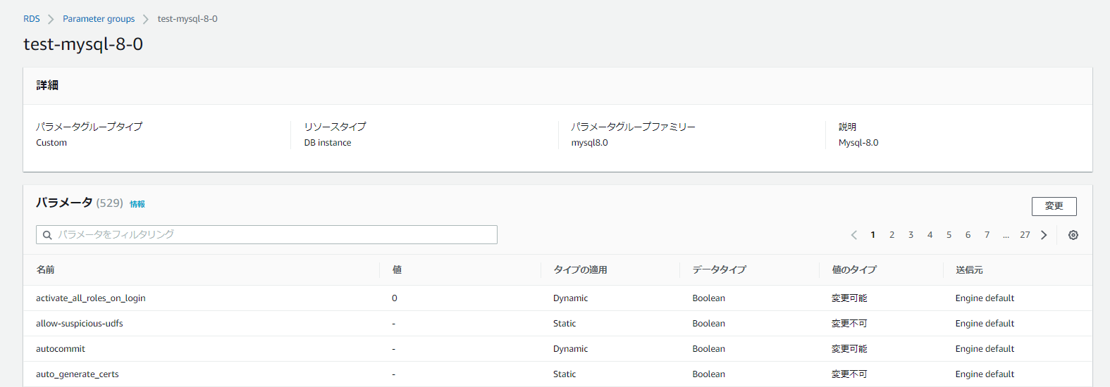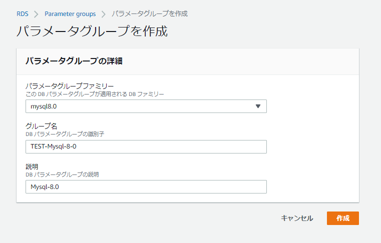 作成したRDSのパラメータグループの変更も可能ですがパラメータによって変更ができないパラメータもあるのでなるべくRDSの作成前に要件にあたうパラメータグループを作成してRDSを作った方がいいと思います。