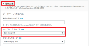 RDSを作成する時、「追加設定」タブを拡張し、パラメータを設定することができます。