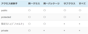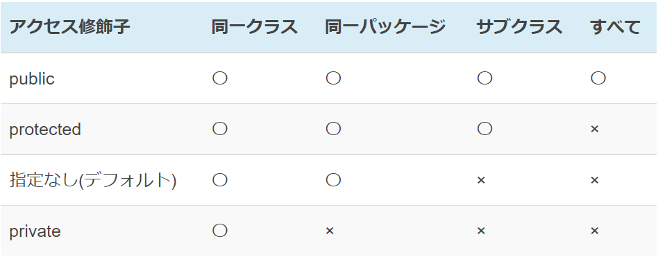 ・アクセス修飾子とは、public、protected、デフォルト(指定なし)、privateといった修飾子の総称で、クラスやそのメンバがどこからアクセス可能であるかを決定しますアクセス修飾子 概要 public すべてのクラスからアクセスできる protected 現在のクラスとサブクラスからアクセスできる デフォルト(指定なし) 現在のクラスと同じパッケージのクラスからアクセスできる private 現在のクラスからだけアクセスできる ※具体的な状況は下図のとおりである