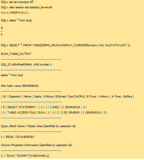 - SQL実行後にDISPLAY_CURSORを実行して、共有プール上の実行計画を確認する。この方法は、実際にSQLを実行しなければなりません。実行計画の内容は実測値を確認することが可能です。