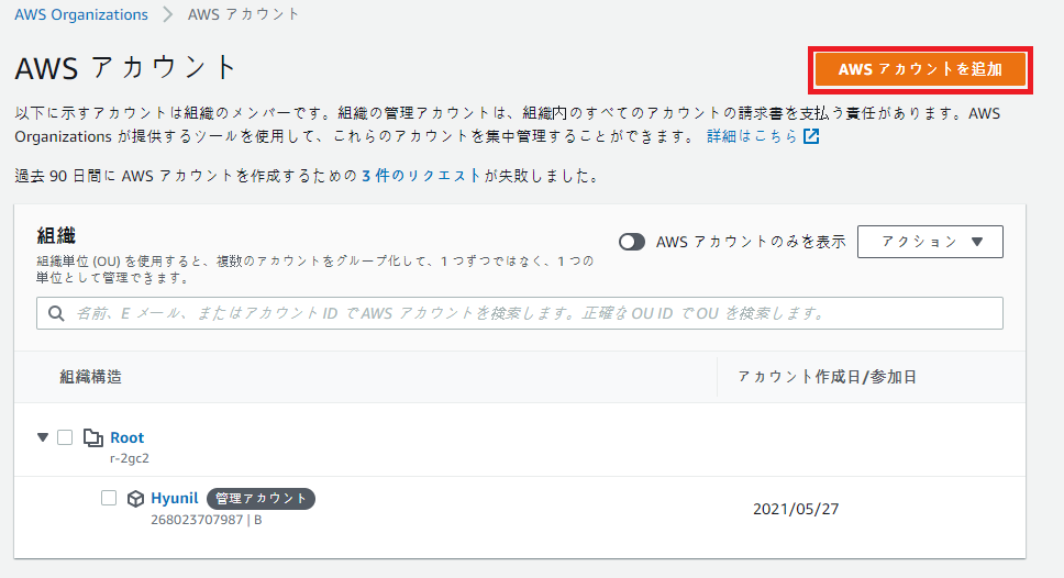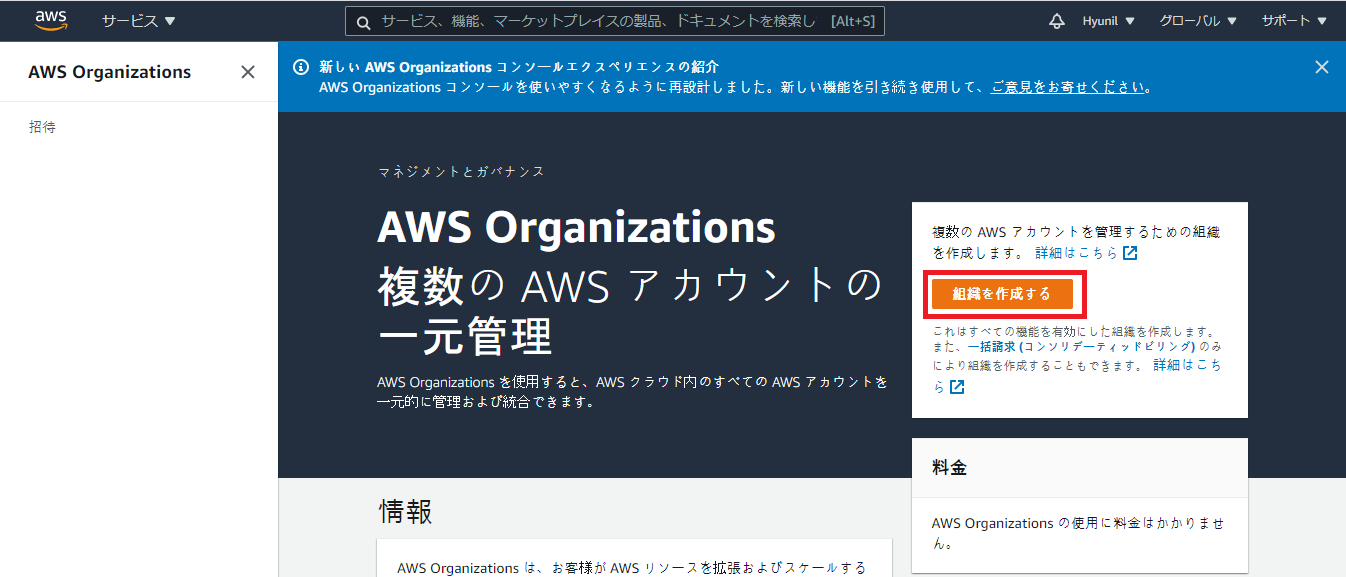 組織を管理するアカウントからAWS Organizations コンソール接続して組織を作成します。