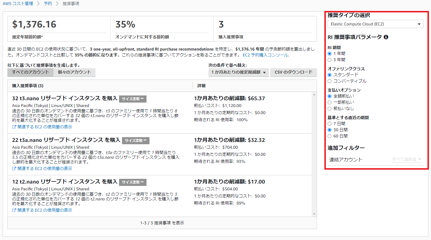 今までのデーターでAWSが推薦するリザーブドインスタンスを確認できます。