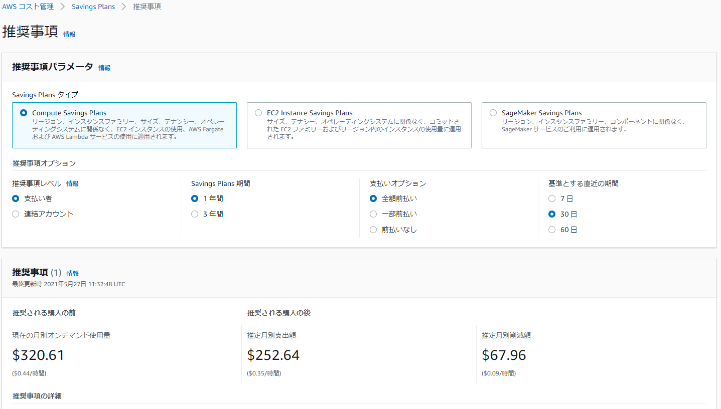 Savings PlansもAWS コスト管理から推奨事項が確認できます。