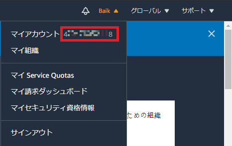 アカウントIDがわからない場合は対象のアカウントにログインして右上の名前がある部分にある▽クリックして確認可能です。