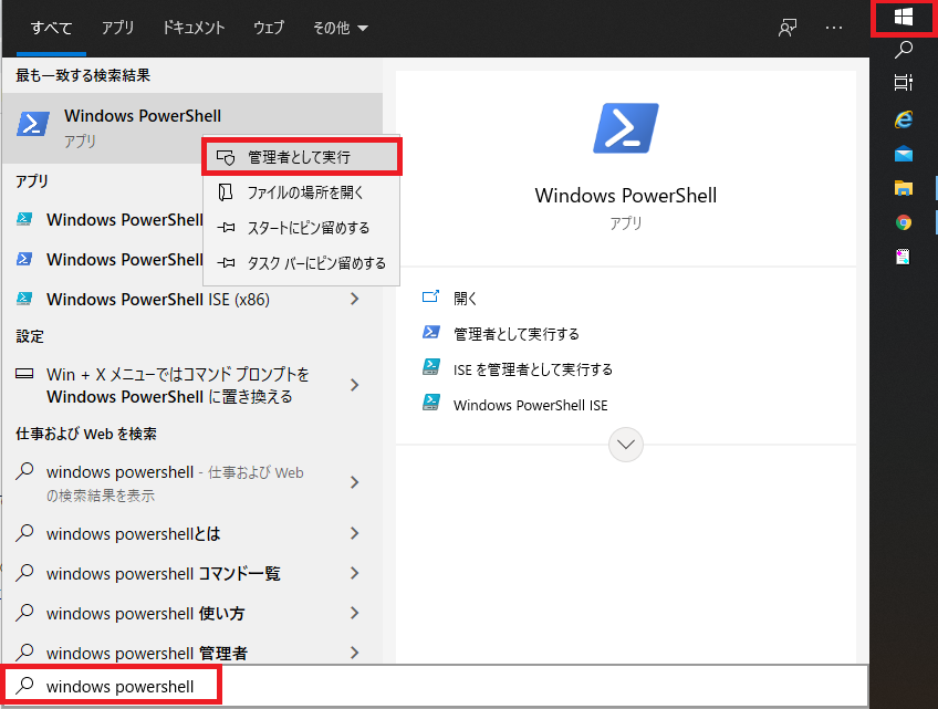 「Windows PowerShell」にマウス右ボタンでクリックし、「管理者として実行」選択してください。