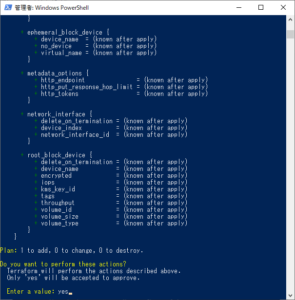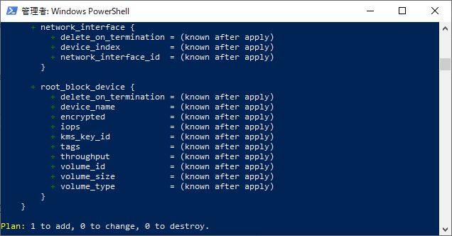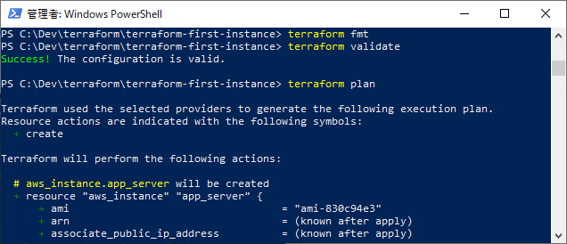 「terraform plan」命令を使用すると、現在定義されているリソースを実際にproviderに適用した時、テラフォームがどのようなジョブを実行するかの計画を示します。