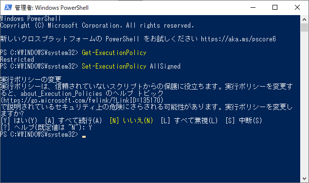「Set-ExecutionPolicy AllSigned」を入力してポリシーを変更してください。