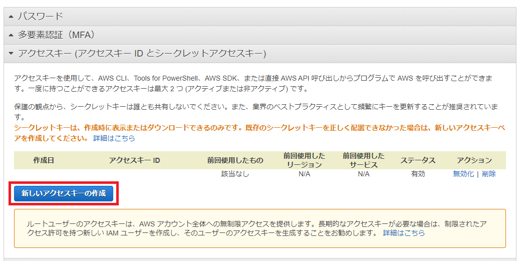 必ず「キーファイルのダウンロード」をクリックしてアクセスキーの情報をダウンロードして安全なとこに保管してください。