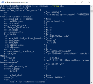 TerraFormで作成したリソースの情報や設定内容などが記録されているし、このステータファイルを参照してリソースを更新、削除もできるので注意して安全などころに保存する必要があります。