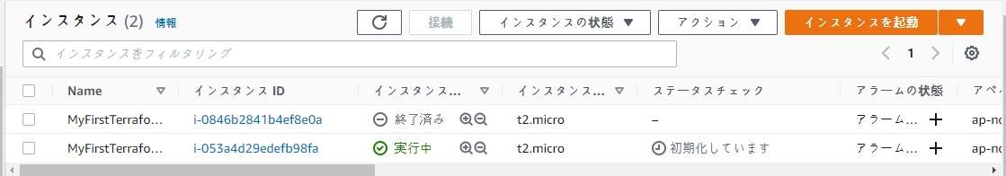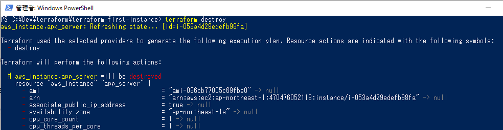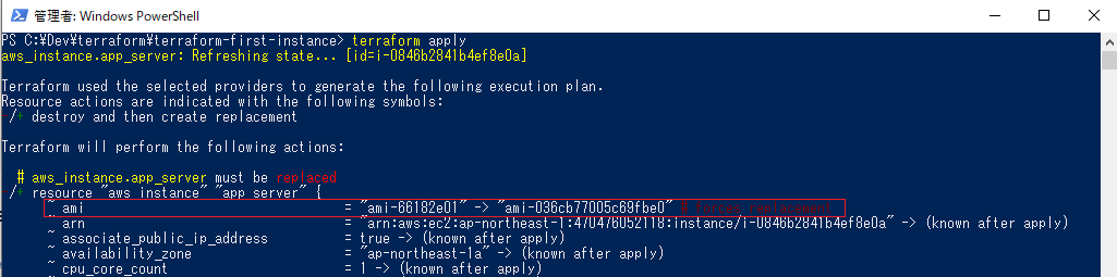 このようにAMIの変更は単純にEC2を修正することでは変更ができないので自動にTerraFormが判断して作り直します。