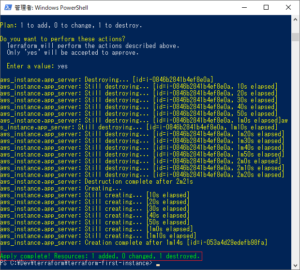 「main.tf」ファイルを修正後「terraform apply」を実行します。