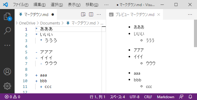 ・*または–の前に半角空白2つ記載するとインデントできる。