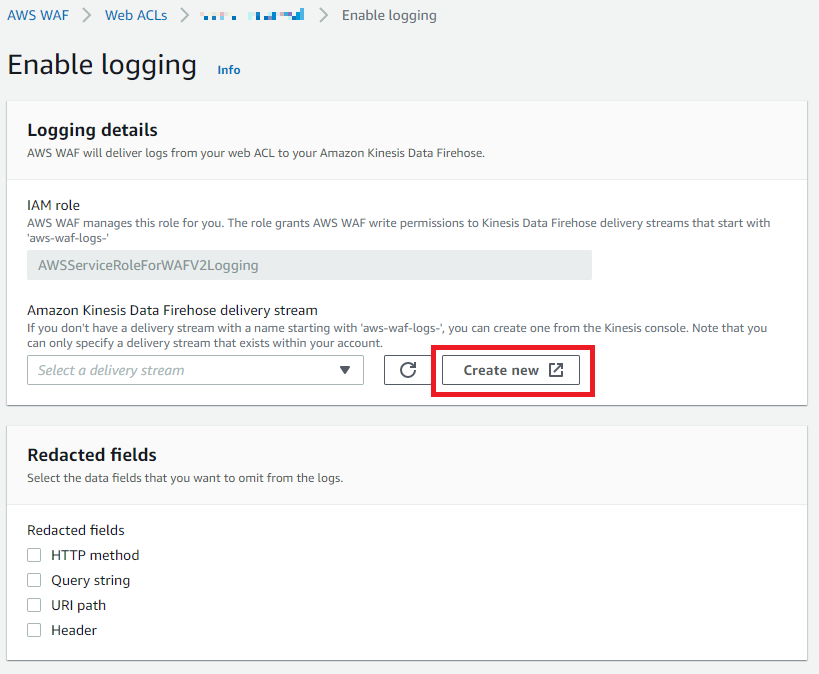 「Amazon Kinesis Data Firehose delivery stream」の右にある「Create new」を選択します。