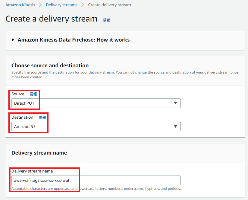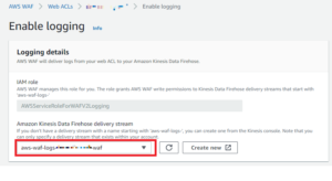 Delivery stream nameは「aws–waf–logs-」が頭に入っている名前にしてください。