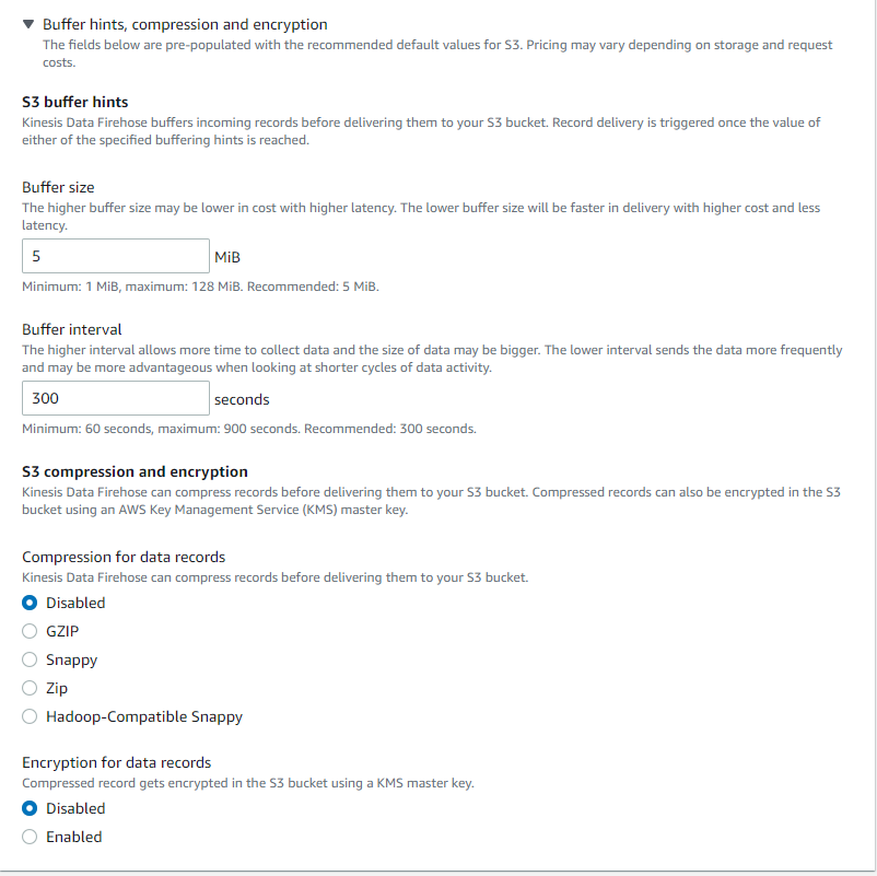 今回は基本設定で「バッファサイズ:5M」「バッファ間隔:300秒」「圧縮 (無効)」「暗号化 (無効)」にしました。「Create delivery stream」を選択してください。