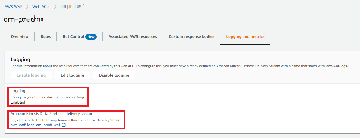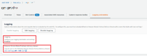 「Logging – Enabled」、「Amazon Kinesis Data Firehose delivery Stream」に設定した「Delivery stream name」が表示されると完了です。