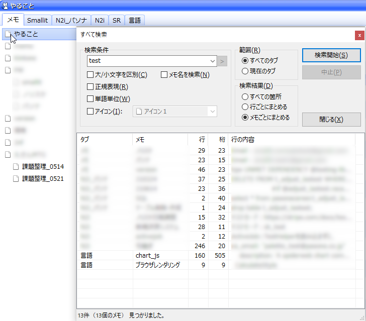 簡単に表示しているセクション内の検査はもちろん、全タブの中から正規表現等の条件を指定して検索することが可能です。