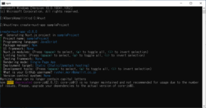- Nuxt.js modules→追加機能を選択する項目。PWA化する際やAxiosを使用する際にはこちらで選択。今回は何も使用しないのでNoneを選択。