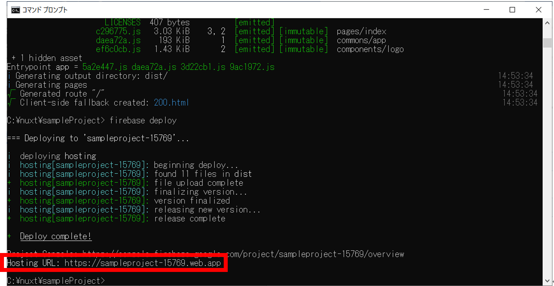 Select a default Firebase project for this directory→先ほど作成した「sampleproject-15769」を選択 - What do you want to use as your public directory?→nuxtのデフォルト吐き出しディレクトリの「dist」を選択します