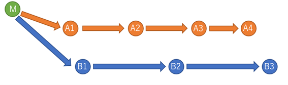 以下の開発状況が考えられる。マスタブランチMは開始時点とし、同時にブランチAとBでA機能とB機能を開発している。
