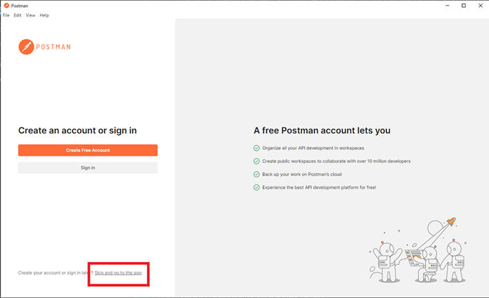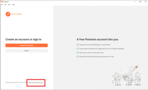 - exeファイル実行後、Postmanを起動。アカウント登録やログインが不要な場合は、画面下部の「Skip and go to the app」を押下すればよい