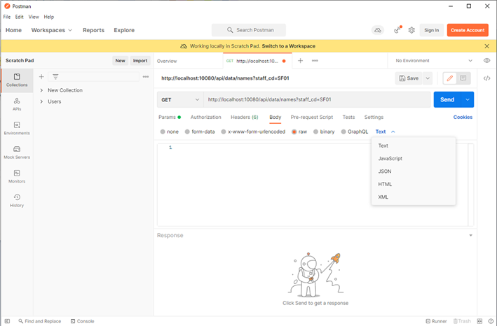 「Body」を押下する。form-dataなど、ラジオボタンを対応する項目にする