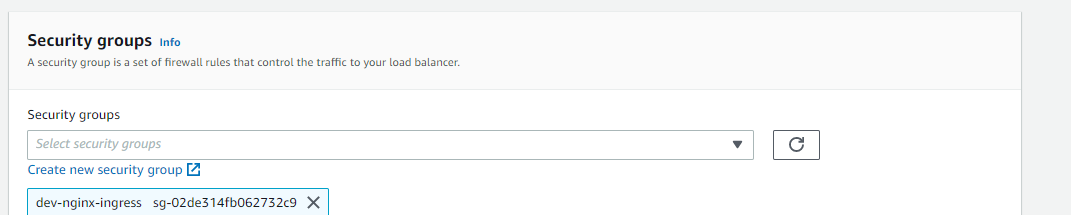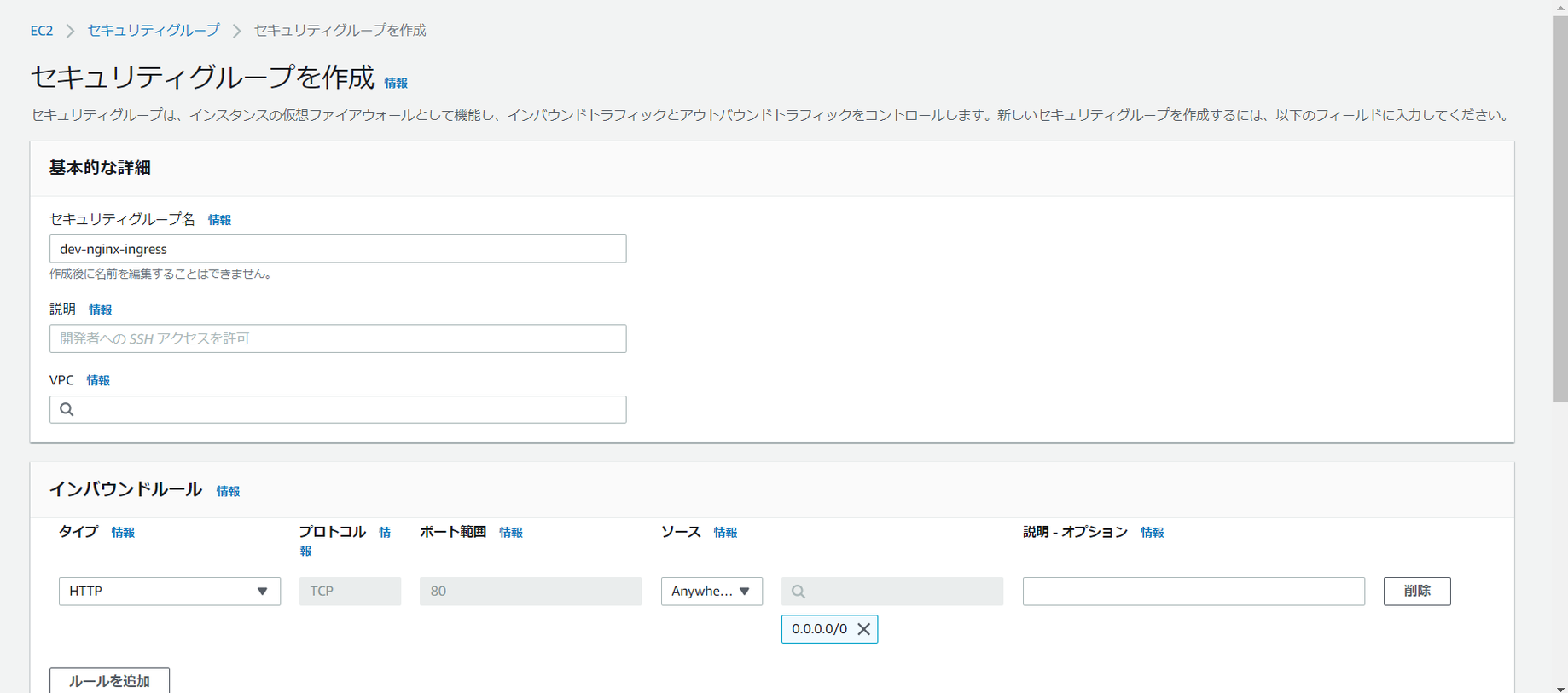 セキュリティグループに【2】で作成した「dev-nginx-ingress」を設定