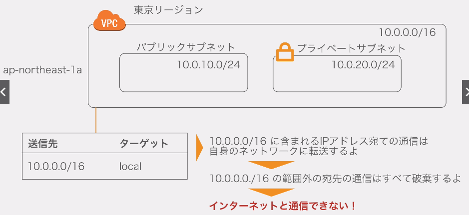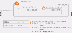 今の状態は、VPCにルートテーブルが設定され、10.0.0.0/16のCIDR範囲のプライベートIPアドレスからの通信のみ、自信に転送する状態になっています。