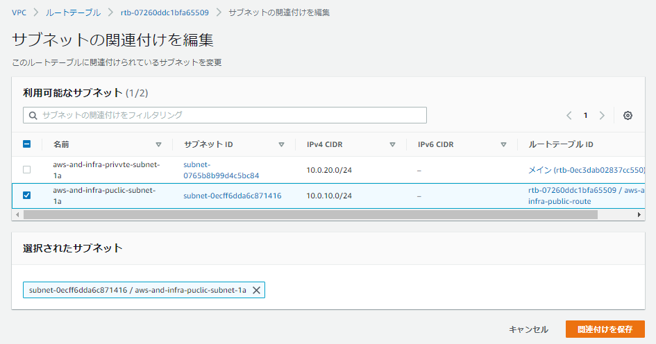 「2.サブネットを構築」で作成したパブリックサブネットを選択し、保存します。