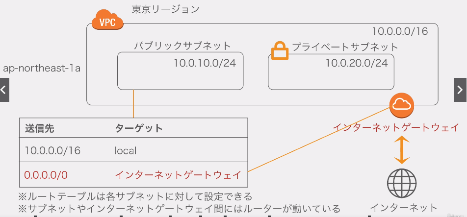 「2.サブネットを構築」までの設定だけでは、インターネットに接続できません。