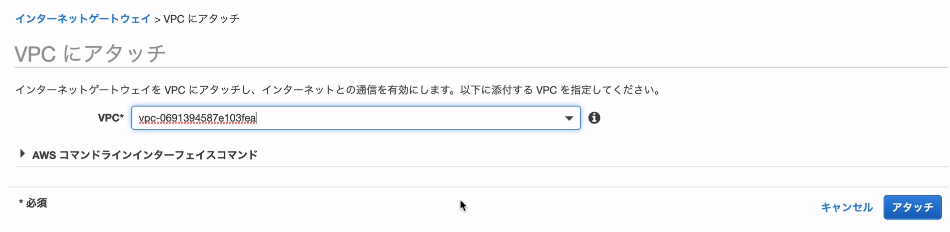 「1.VPCを設定」で作成したVPCを選択し、アタッチを選択します。