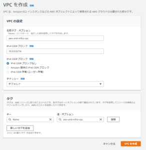 IPv4 CIDRブロック:10.0.0.0/16(10.0.0.0/16の場合、10.0.0.0 ~ 10.0.255.255までがVPCの範囲となる。10.0.0.0/24なら10.0.0.0 ~ 10.0.0.255までがVPCの範囲となる。
