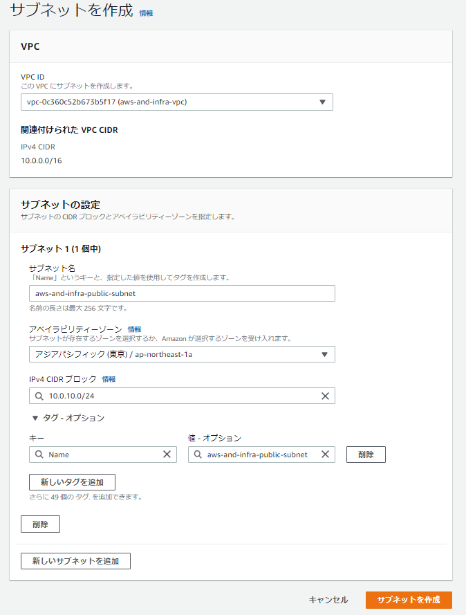 IPv4 CIDRブロック:一般的には10.0.0.0/24 ~ 10.0.255.255/24の範囲でサブネットの範囲を設定します。