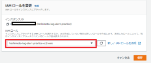 STEP12 ロールの作成:ロール名にhashimoto-log-alert-practice-ec2-roleと入力し、ロールの作成を押します。