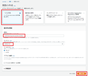 STEP1 赤枠の部分を設定します。一から作成を選択します。関数名を入力します。私の場合は、「hashimoto-log-alert-practice-lambda」にしました。ランタイムにPythonを選択します。あとはデフォルトのまま、関数の作成を押します。