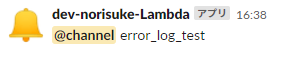 15行目:「dev-hashimoto-Lambda」という名前でslackに通知が来ます。変更したい場合はここを変更します。