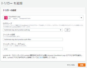 フィルターパターン(検出したい文字列):ログファイルにどの文字が検出されたら、Lambdaを実行するかを指定します。ここでは「error」という文字列がログファイルに書かれたらLambdaが実行されるようにします。