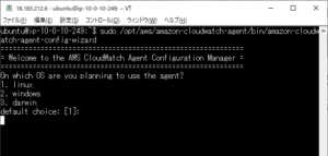 CloudWatch Agentの設定ファイルを作成します。CloudWatch Agentの設定ファイルを作成するには、amazon-cloudwatch-agent-config-wizardを起動し、質問に回答することで「/opt/aws/amazon-cloudwatch-agent/bin/config.json」に作成されます。以下は質問の設定です。