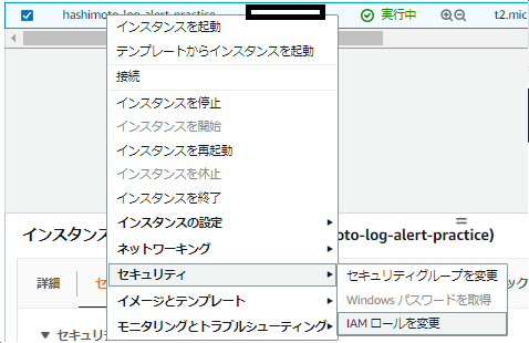 STEP13 IAMロールの割り当て:EC2のダッシュボードに戻り、作成したEC2インスタンスを右クリックし、セキュリティ → IAMロールを変更を押します。
