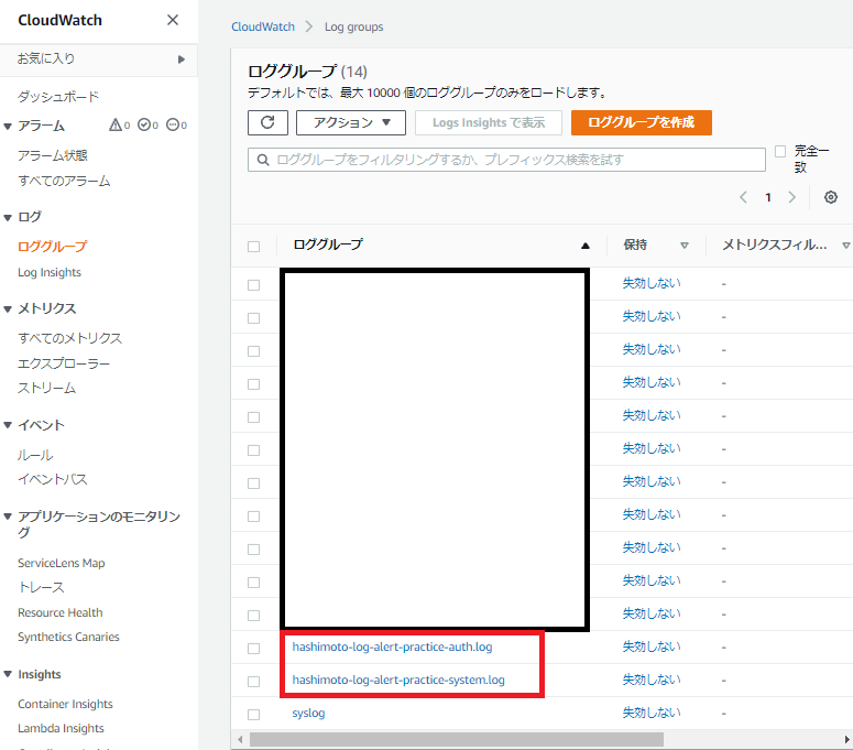 ロググループ:CloudWatch agentの設定 4-9で設定したロググループ名を指定します。
