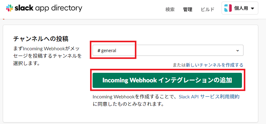 Slackにログインした状態でチャンネルを選択し、赤枠をクリックするとlambdaが実行されたときに、そのチャンネルに通知を送ることができるURLが発行されます。