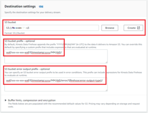 「S3 bucket error output prefix – optional」には「!{firehose:error-output-type}」のインスタンスを少なくとも 1 つ含める必要があると思います。