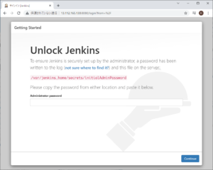 始めてJenkinsにアクセスすると、Administrator passwordを求められるので、