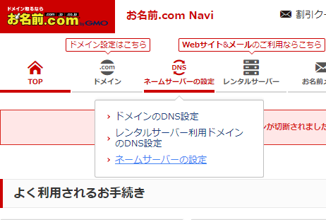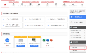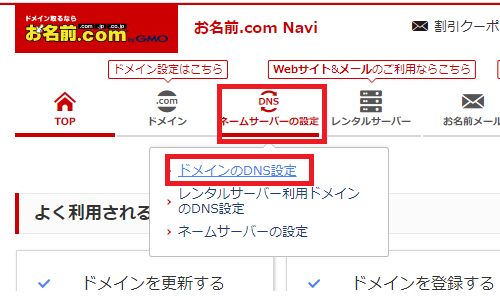 STEP1:ドメインを購入したサイトにログインし、ネームサーバの設定画面を開きます。