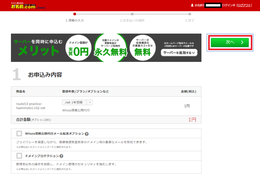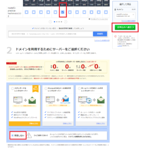 STEP3:ルートネームサーバを選択、サーバを利用するかどうかを選択します。今回はテストなので、1円のドメインを選択します。また、サーバも利用しないにチェックを入れます。