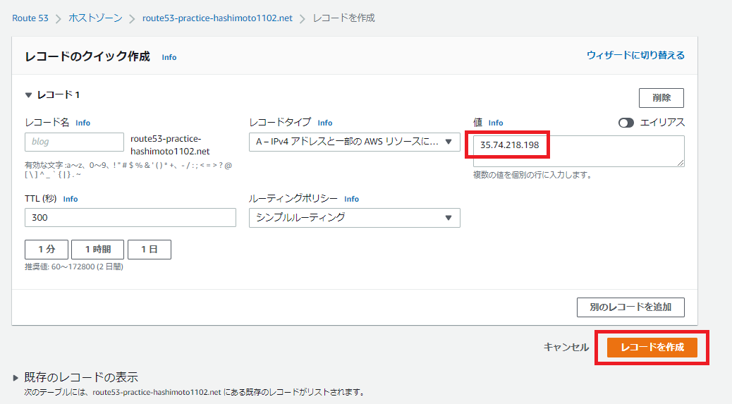 STEP10:先程割り当てたElastic IPアドレスを値に入力し、レコードを作成ボタンをクリックします。