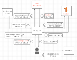 ここで重要なのは、オレンジ文字の部分で、comのネームサーバが「⑤Route53が知ってるよ」と教えてくれているところと、⑥⑦でRoute53が聞かれたドメインに対してIPアドレスを返しているところです。