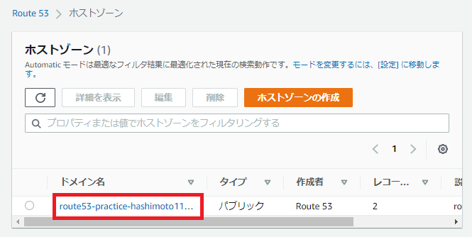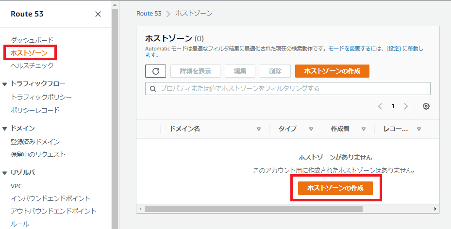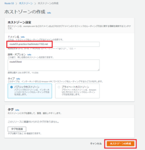 STEP2:購入したドメイン名を入力し、ホストゾーンの作成をクリックします。