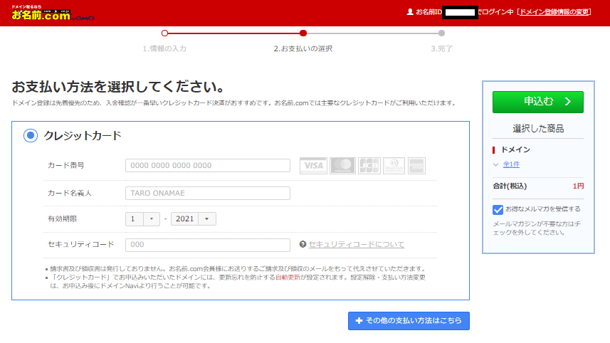 STEP5:クレジットカードの情報を入力し、申し込むボタンを押します。ちなみに、私はお得なメルマガを受信するはチェックをオフにしました。笑