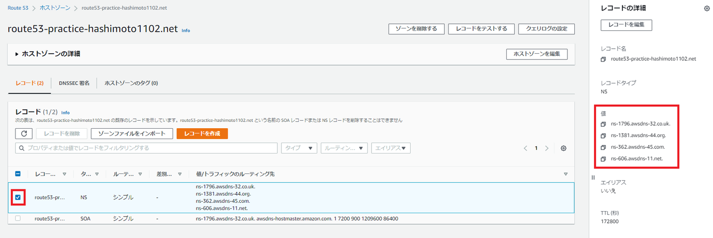 STEP11:タイプがNSとなっているレコードのチェックボックスをクリックします。右に出てきた値を4つともコピーします。この4つの値をネームサーバに登録することが、一番最初の図の④⑤の設定に当たります。